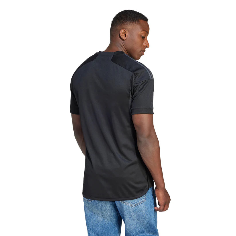 Soccer elegance. It's hard to describe, but you know it when you see it. A nod to Real Madrid's sparkling away performances, the Real Madrid 23/24 Third Jersey keeps things classy with a black base and embroidered "RMCF" wording on the left side of the Henley collar. Sweat-wicking AEROREADY helps to keep you feeling dry, while mesh details add to the comfort for stellar performances on the pitch. Made with 100% recycled materials, this product represents just one of our solutions to help end plastic waste.